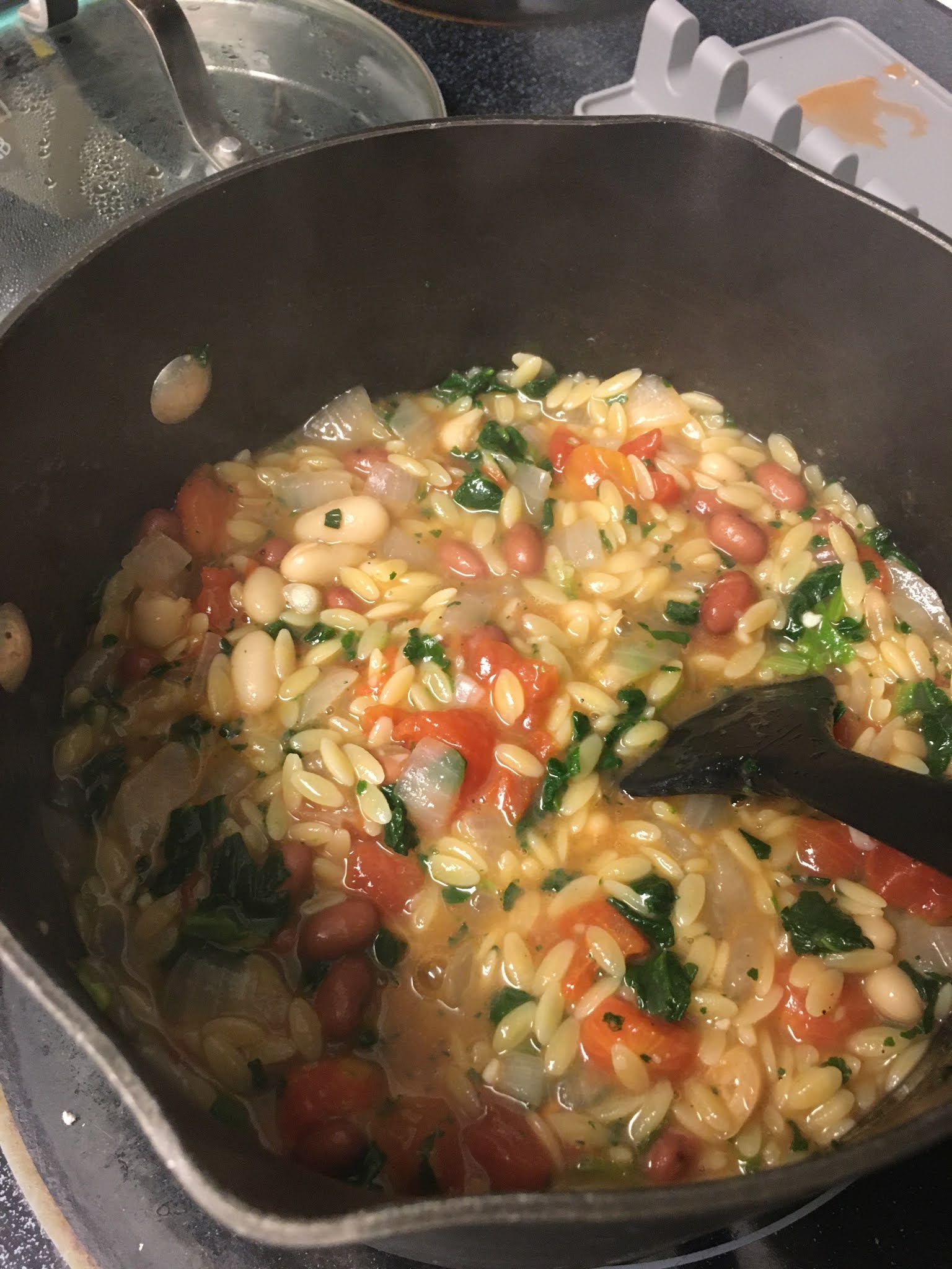 Cover, reduce to a simmer, and stir frequently to prevent sticking. Cook until the liquid is all absorbed and the pasta is cooked, about 10 minutes. Stir in the spinach and cooked veggies, if desired.