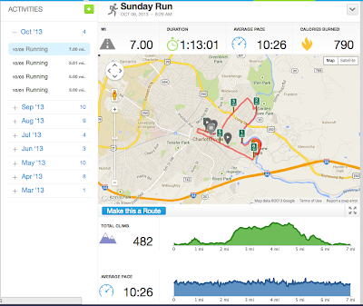 Now for the 7 mile run! Joey helped me plot out a run that would avoid lots of pedestrians. I've gotten to the point where having to run zigzags around people is worse than hills. I don't know if that says something about my endurance, or about my complete lack of patience and hatred of undergrads here...